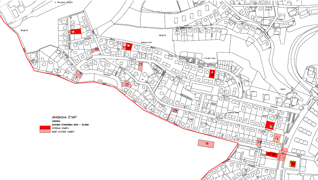Přítomné jsme stručně seznámili s činností spolku za 4 roky od jeho založení. Díky možnosti promítat na rozměrné plátno jsme mohli účastníkům ukázat řadu dokumentů a materiálů, které spolek vypracoval. Pozornost vzbudila informace o vydaných závazných stanoviskách na stavební záměry v Jiráskově čtvrti, dokumentovaná zákresem těch, co nás nejvíc ohrožují, do mapového podkladu (sytě červená barva).